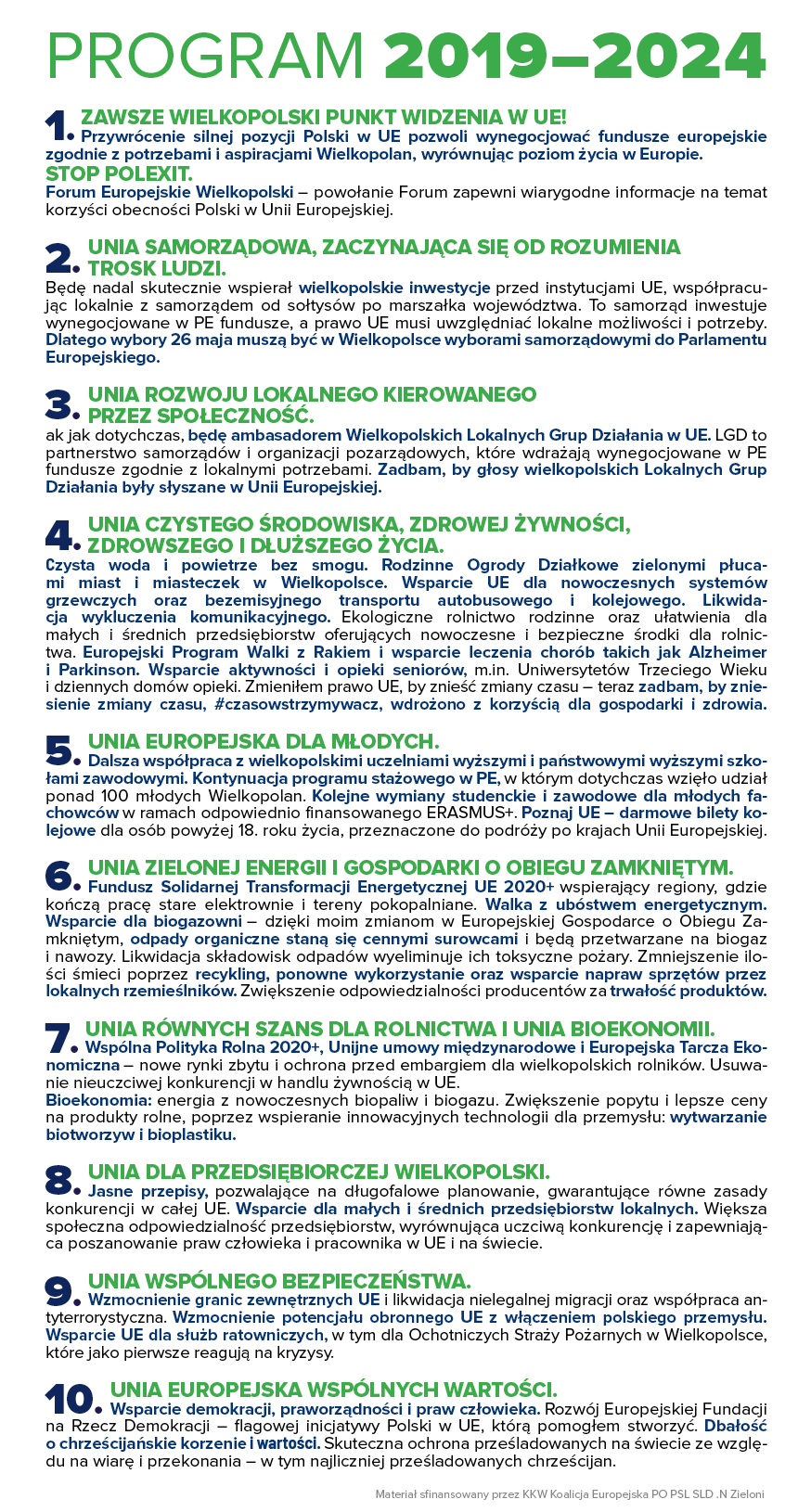 Silna pozycja Polski pozwalająca wynegocjować budżet i prawo UE odpowiadające potrzebom i wspierające aspiracje Wielkopolan. Tylko tak zagwarantujemy, europejski poziom życia w Wielkopolsce. STOP POLEXIT – przywrócenie silnej pozycji Polski w UE. Powołanie Forum Europejskiego Wielkopolski przeciw antyeuropejskiej propagandzie, na rzecz wzmacniania świadomości w Polsce korzyści obecności w UE.